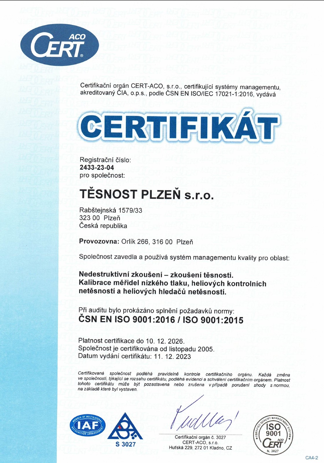 Naše společnost TĚSNOST PLZEŇ s. r. o. se zabývá návrhy a realizací zkoušek těsnosti dle kritérií, popřípadě písemného předpisu zákazníka. Na základě požadovaných kritérií se volí typ a patřičná citlivost zkoušky, která je dále konzultovaná se zákazníkem. Specializujeme se nejen na zkoušky těsnosti, ale mezi činnosti naší firmy TĚSNOST PLZEŇ s. r. o. patří také měření těsnosti, kalibrace měřidel a služby v oblasti defektoskopie.